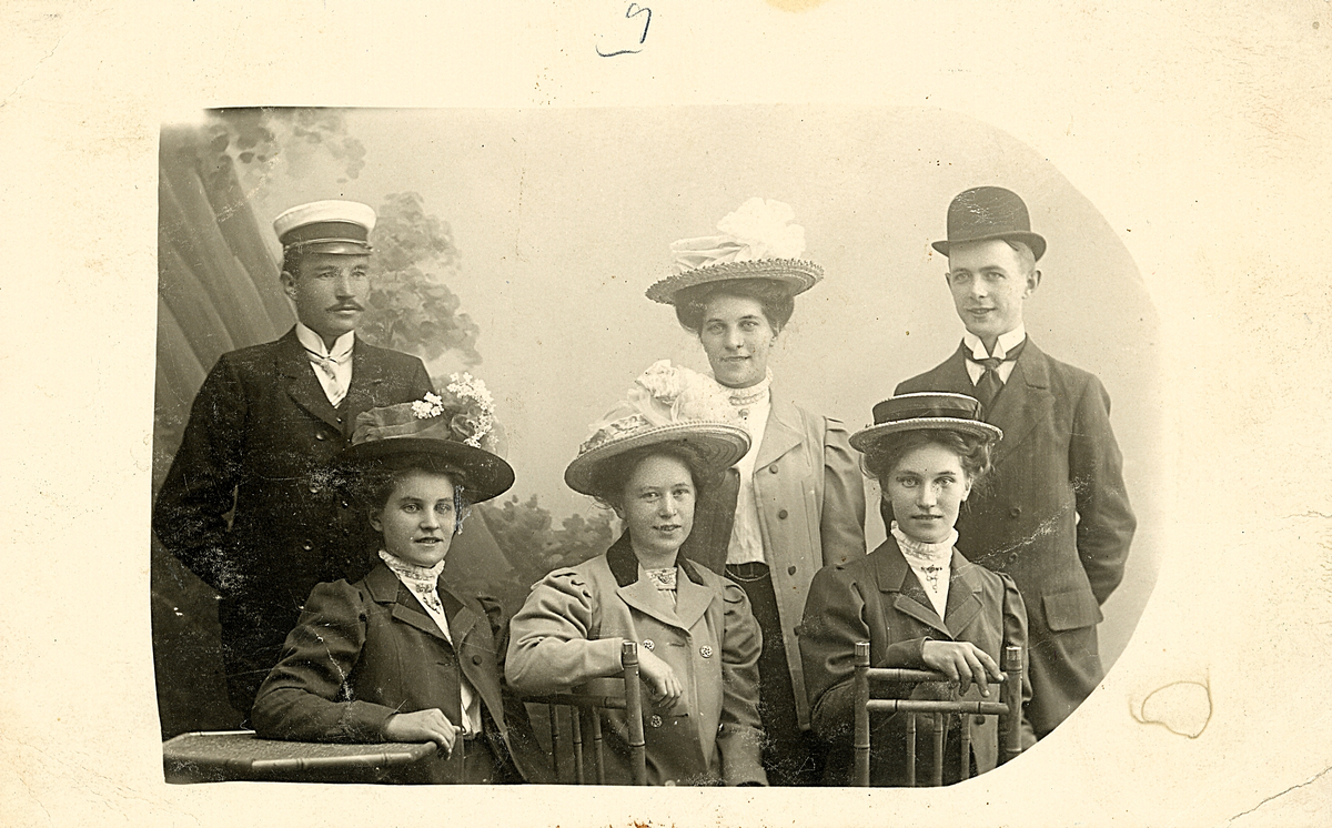 Kvinnor och män uppklädda för porträttfotografering.