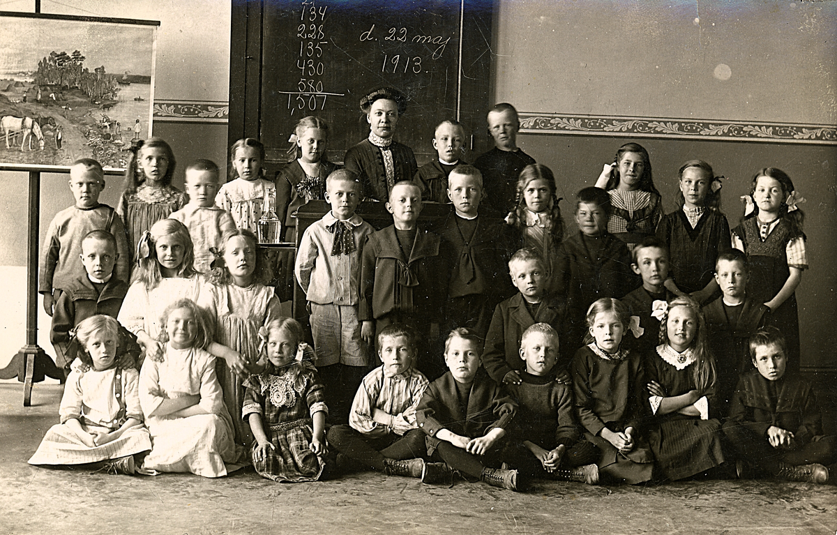 Gruppbild av en skolklass, daterat den 22 maj 1913, då det står på svarta tavlan bakom klassen.