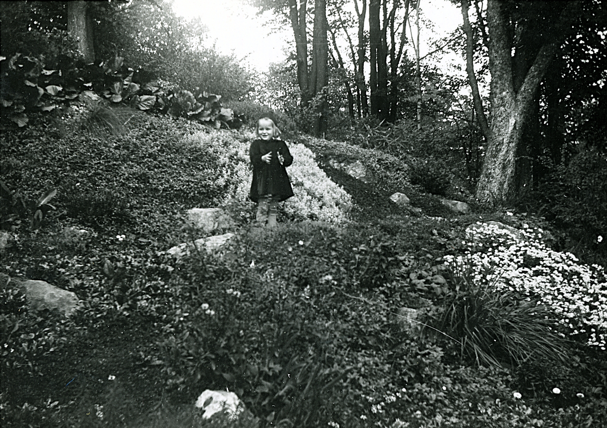En liten flicka som står i en sluttning omgiven av tät vegetation och träd, möjligen i en park.