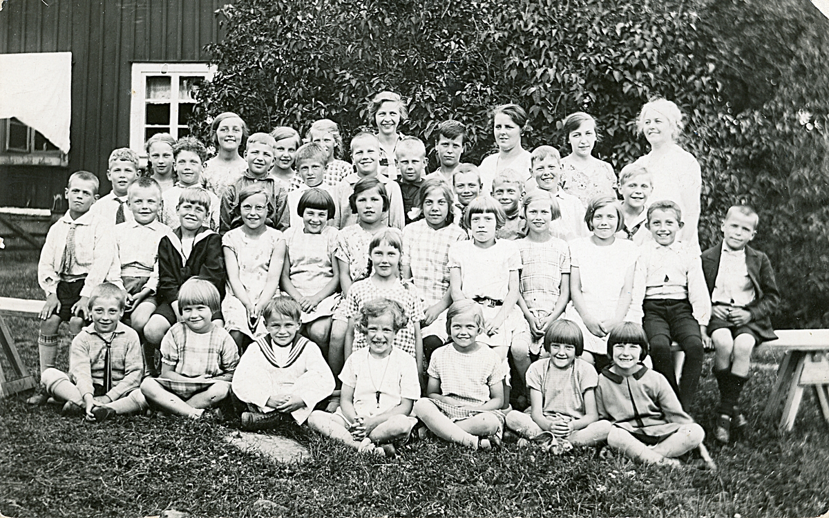 En klass som poserar utomhus för gruppfotografering med en byggnad i bakgrunden.