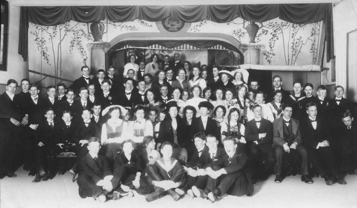 Gruppfotografi föreställande cirka 6070 ungdomar och unga vuxna samlade på en scen i en dekorerad samlingssal. Scenen är försedd med draperad ridå och målad fond med kolonner och växtmotiv samt en lyrsymbol ovanför scenöppningen. Deltagarna är klädda i festkläder; männen i mörk kostym med fluga och kvinnorna i ljusa klänningar, några med hatt eller folkdräktsinspirerade plagg. Bilden är sannolikt tagen i samband med föreningsverksamhet, musik- eller teaterframträdande under 1910- eller 1920-tal.