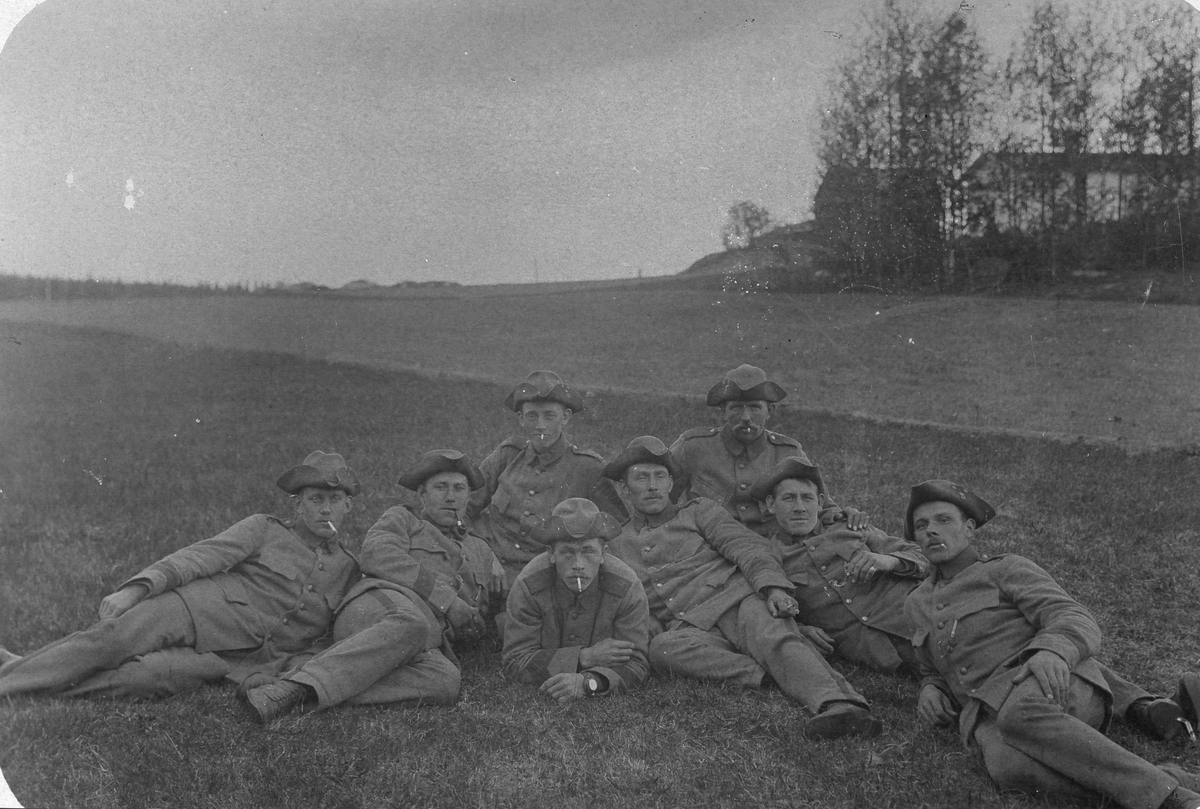 Grupporträtt av åtta uniformerade män som ligger och sitter tätt tillsammans på en gräsbevuxen mark i ett öppet landskap. De bär militäruniformer med mössor och flera av dem röker cigarett. Männen är avslappnat poserade och ser mot kameran. I bakgrunden syns öppna fält, en höjd med träd samt en byggnad, vilket tyder på att bilden är tagen utomhus i lantlig miljö. Fotografiet förefaller vara från tidigt 1900tal.