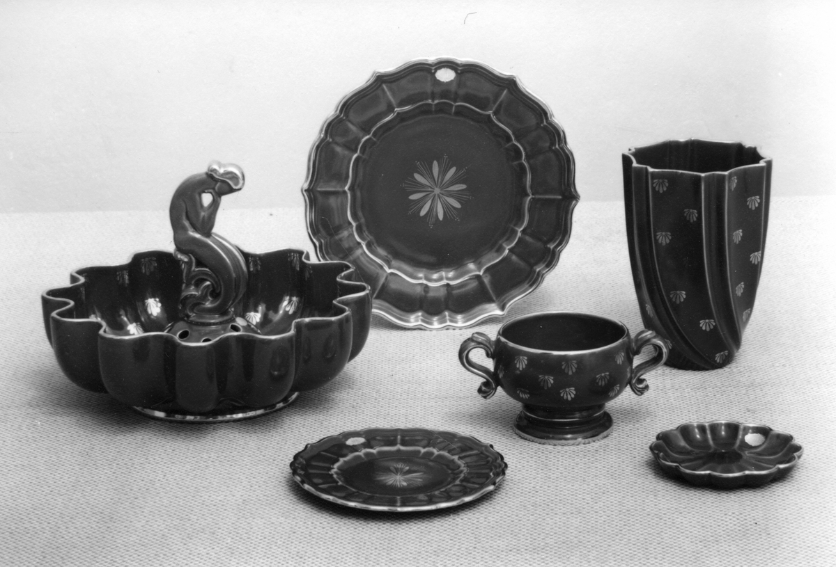 Vas modell BX höjd 10 cm, vas modell GV höjd 20 cm, askfat modell AK diameter 13 cm, frukttallrik modell W diameter 18 cm,