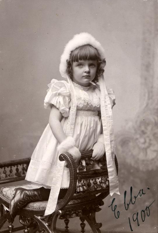 Svartvitt ateljéfotografi av en flicka i vit klänning. Hon står på knä på en ornamenterad pall. Hon har vita handskar med päls runt handleden samt en mössa i vit päls. Från mössan hänger långa vita band.