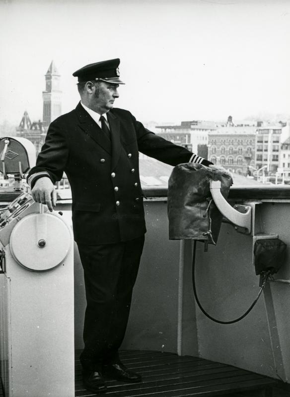 Svartvitt fotografi i helfigur av Oskar Ekrot. Ekrot står, iklädd uniform, på däck på ett fartyg. I bakgrunden syns delar av centrala Helsingborg.