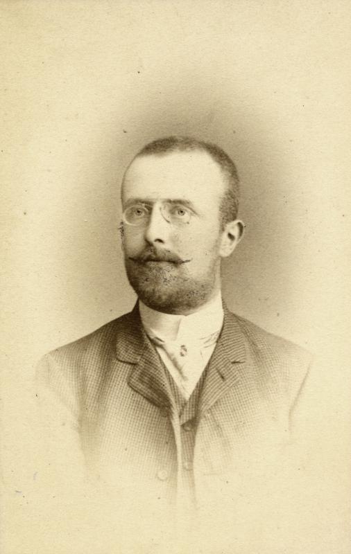 Beskrivning: Svartvitt ateljéfotografi av en man. Han har mustach, skägg och glasögon.