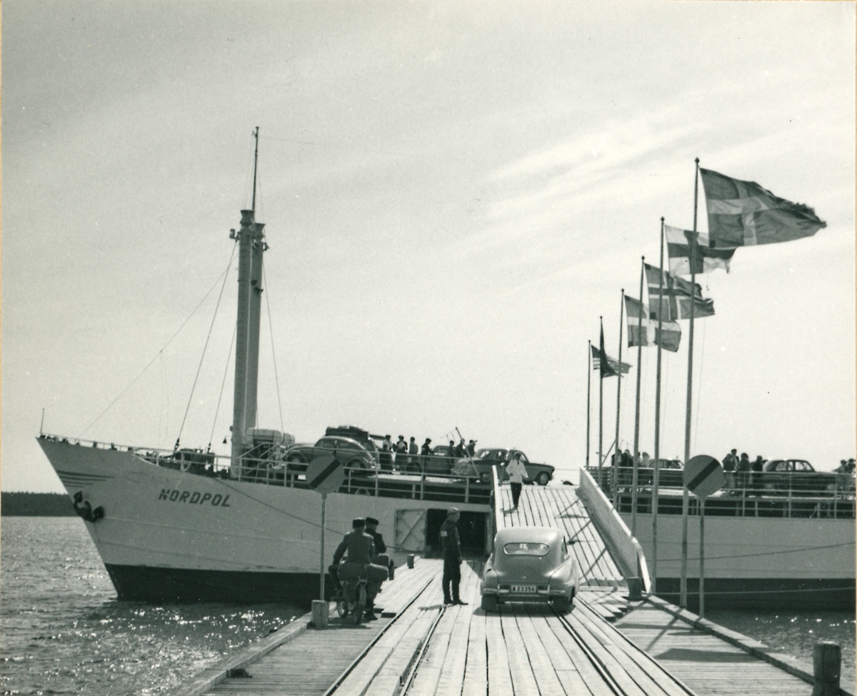 Familjen Erikssons tältsemestrar med bil på 1950- och 1960-talet. Färjeterminalen vid Grankullavik på norra Öland där ett ombyggt lastskepp tjänstgjorde som färga.