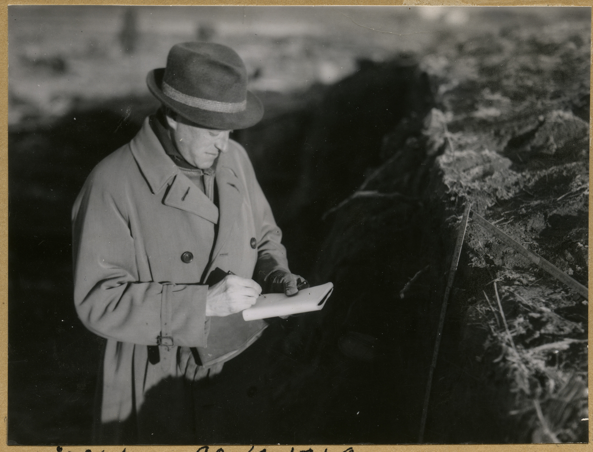 Bild på Landsantikvarie Egil Lönnberg stående och antecknar vid jordvall