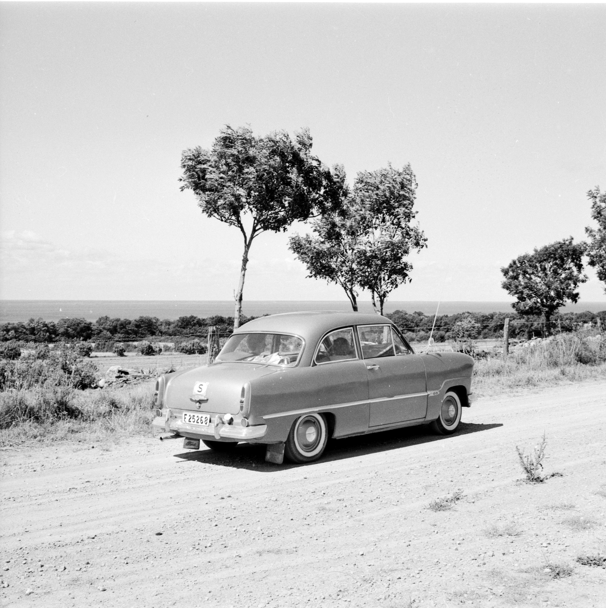 Familjen Erikssons tältsemestrar med bil på 1950- och 1960-talet. Familjens bil, Ford Taunus med registreringsnummer F25268, vid Grankullavik på Öland 1952.