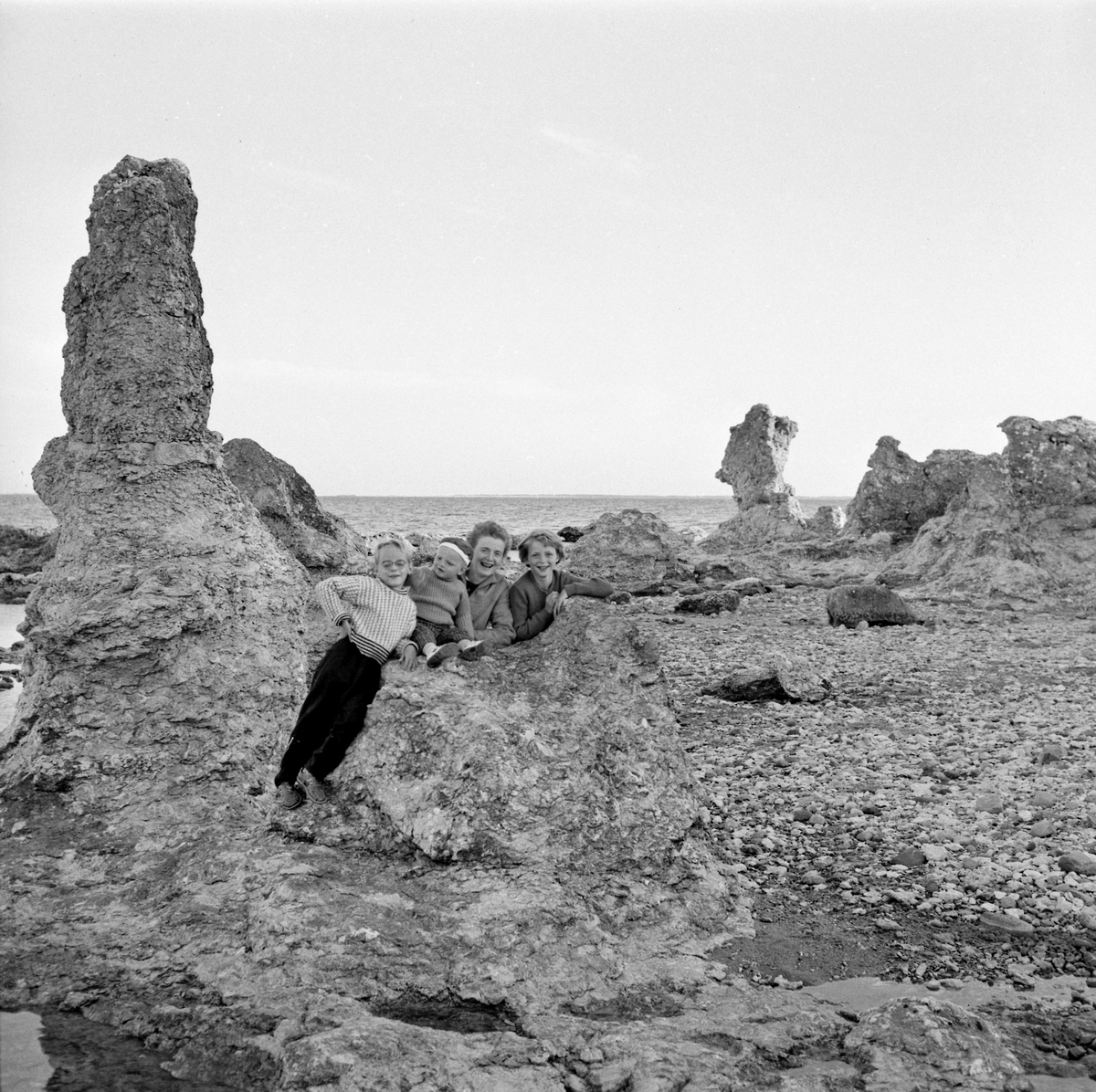 Familjen Erikssons tältsemestrar med bil på 1950- och 1960-talet. Familjen vid Folkhammars raukfält vid Ljugarn på Gotland 1959. På bilden från vänster Thomas, Björn, mamma Gun-Britt och Bodil.