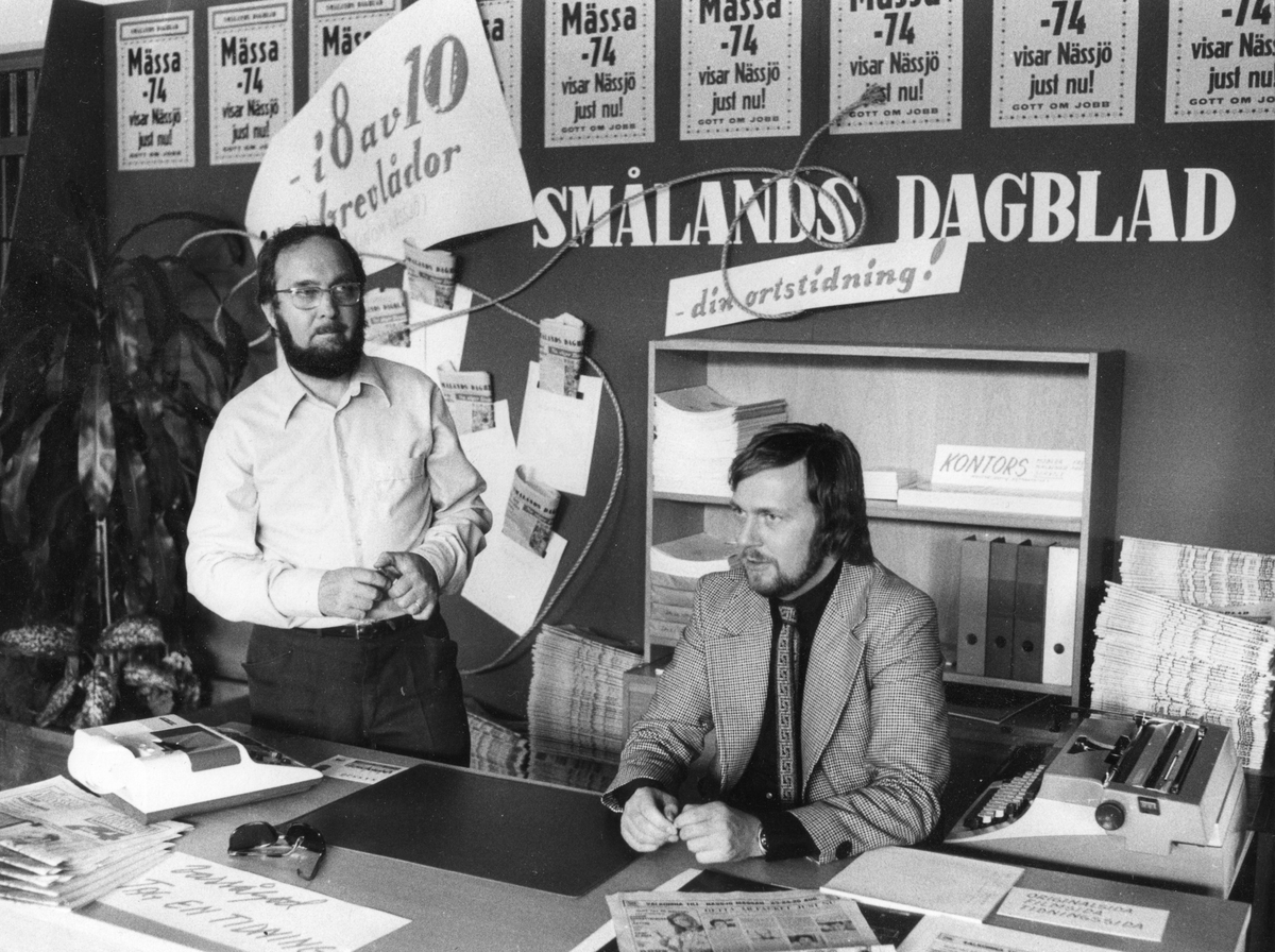 Thore "Tex" Erixzon som annonschef på lokaltidningen Smålands Dagblad i Nässjö. Till höger medarbetaren Curt Hårdh. Foto från 1970-talet.