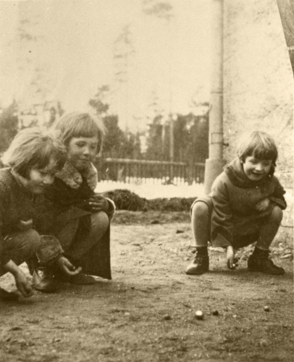 Puttekula med kompisar i gruset på gården i stadsdelen Ahlsberg i Nässjö på 1930-talet. Gun-Britt Edberg till höger i bild.
