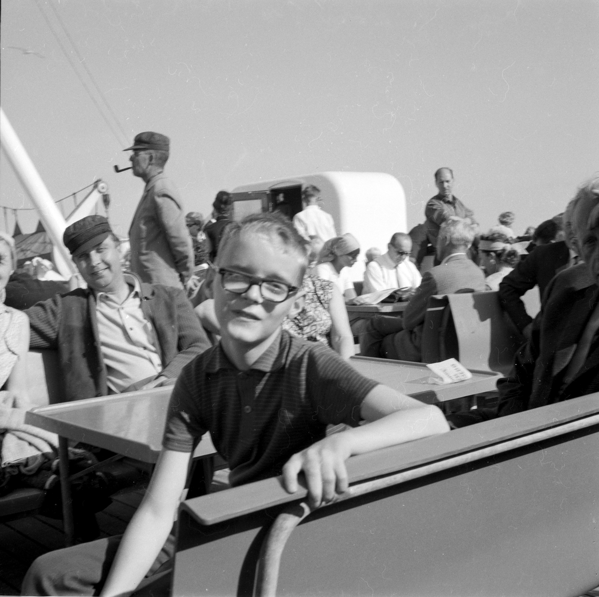 Familjen Erikssons tältsemestrar med bil på 1950- och 1960-talet. Thomas och pappa Thore ombord på färjan till Gotland 1959. Thore sittande med keps.