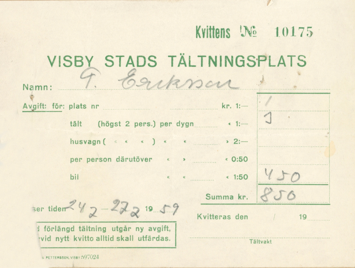 Familjen Erikssons tältsemestrar med bil på 1950- och 1960-talet. Biljett från Visby stads tältningsplats.