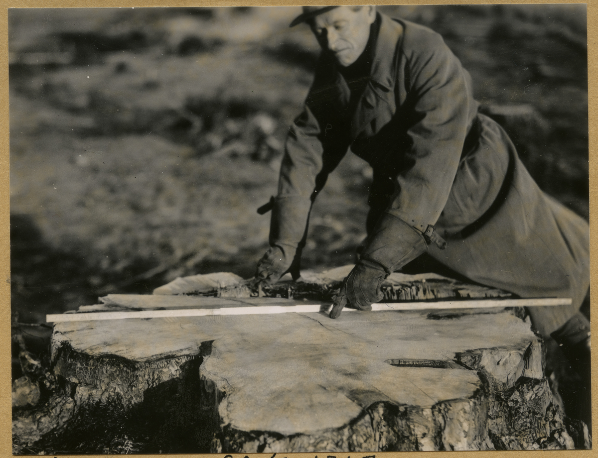 Bild på Landsantikvarie Egil Lönnberg stående och mätandes av en stubbe