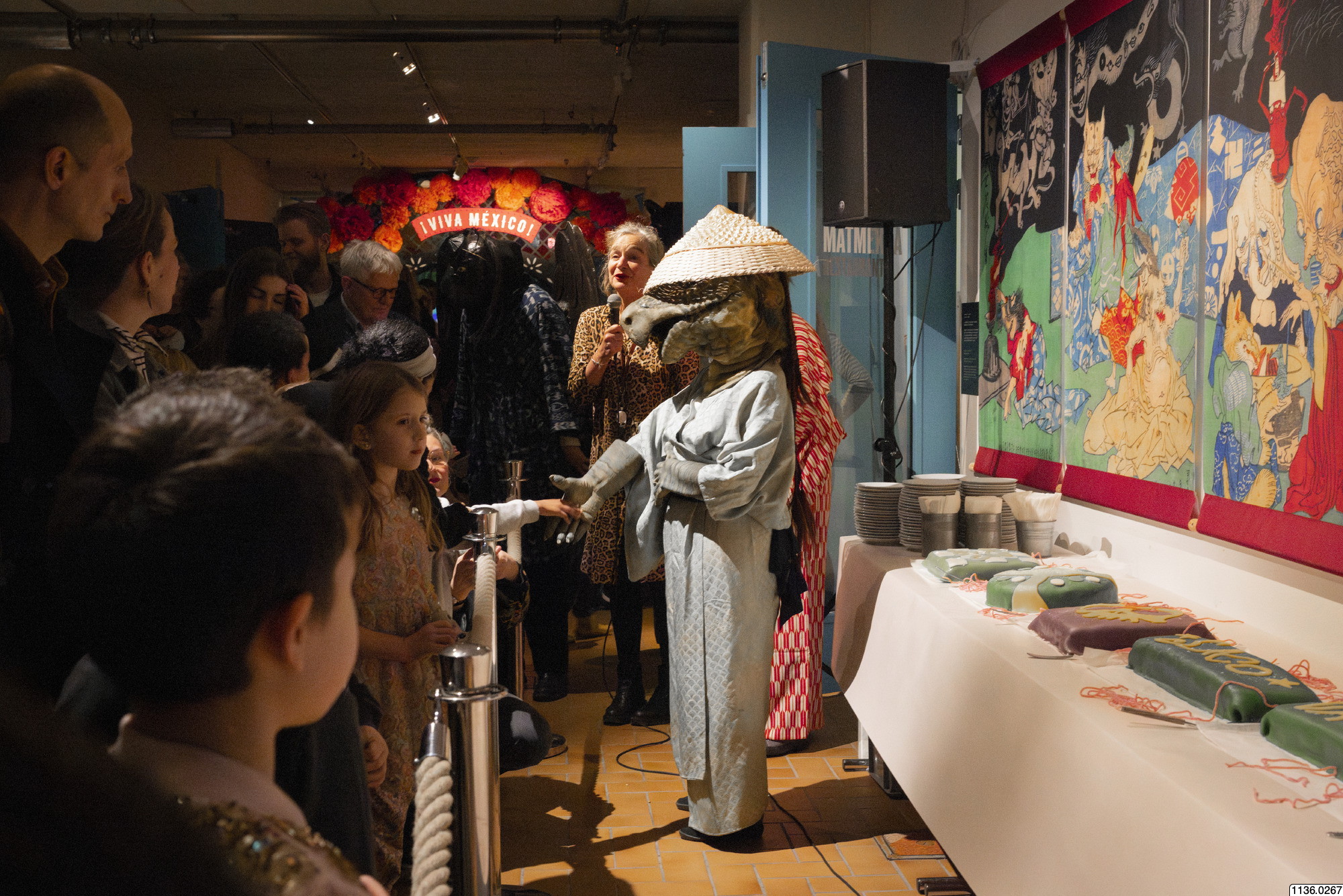 Christina med mikrofon i gallerigången. Tårtor har dukats upp. Etnografiska museets öppning av utställningen sagovärldar.