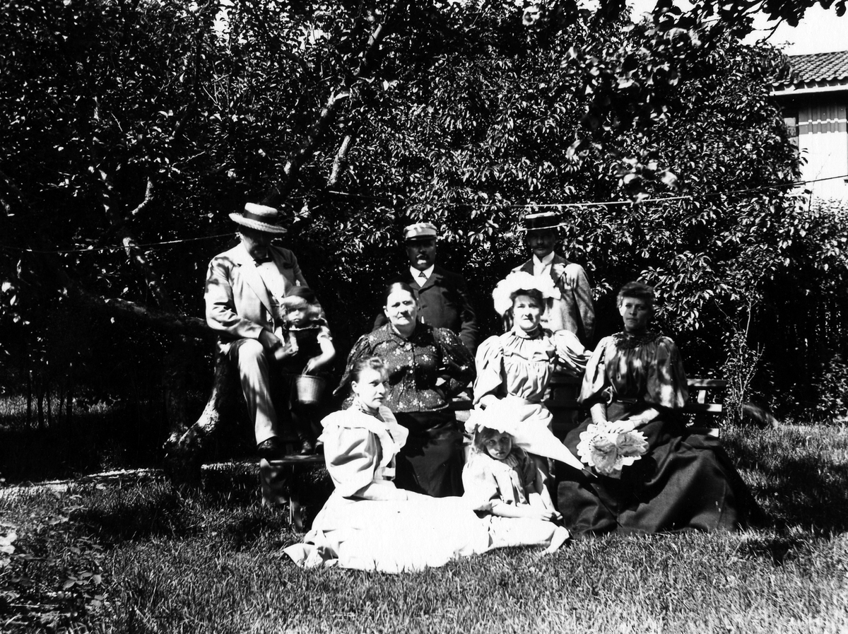 Gruppbild på tre män, fyra kvinnor och två barn som sitter i en trädgård, kvarteret Gustav.