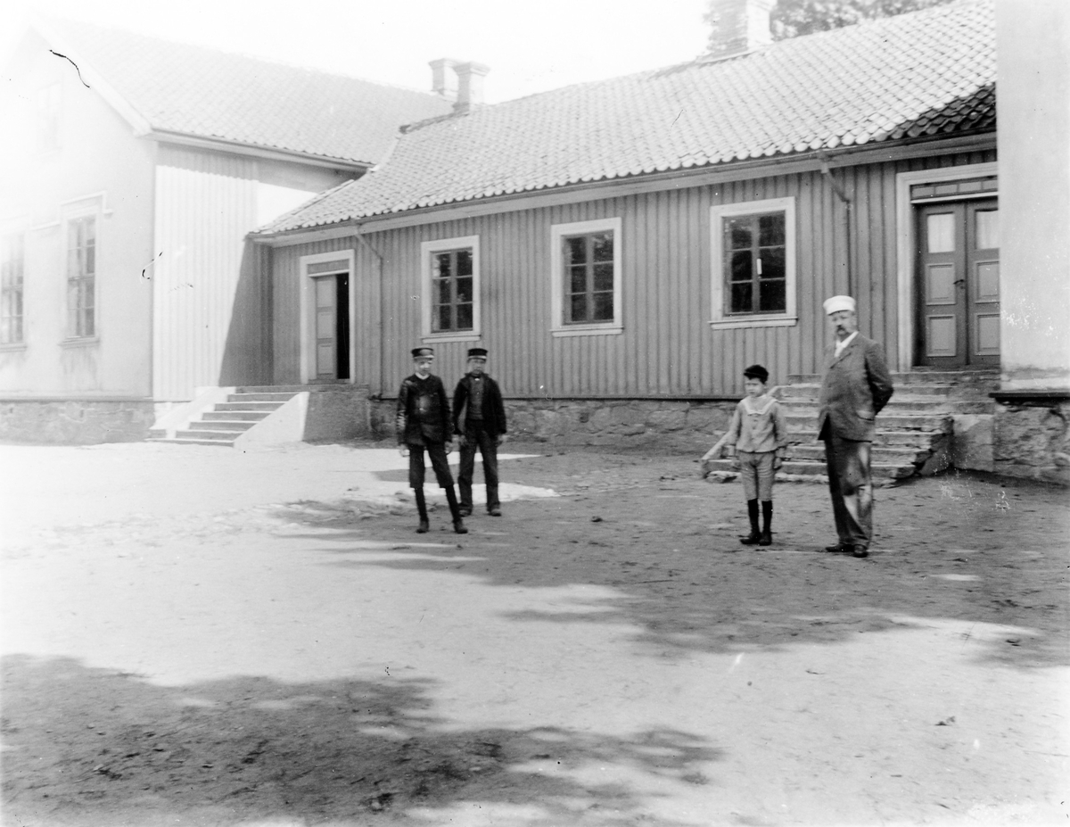 Tre pojkar och en lärare ute på skolgården till Centralskolan i Alingsås.