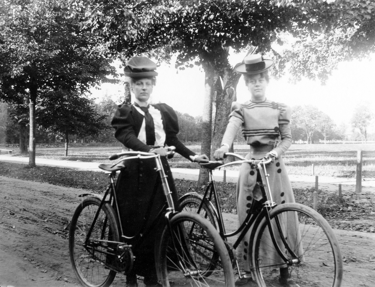 Två kvinnor på cykeltur, iklädda klänning och hatt, poserar bredvid varandra med var sin cykel på Norra Ringgatan.