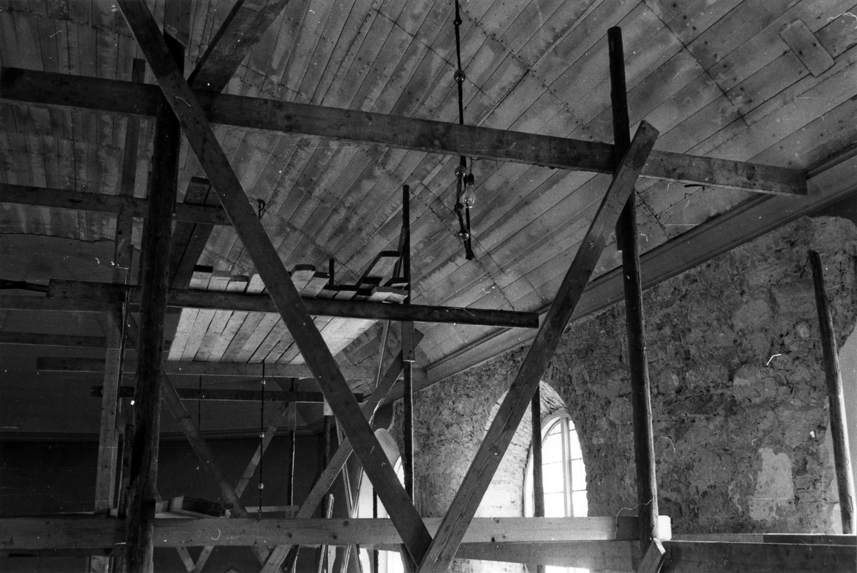 Alingsås stadskyrka under renoveringen 1963 som gjordes efter ritningar av arkitekten Åke Porne. Bilden visar tunnvalvet mot öster med taket över koret i bakgrunden.