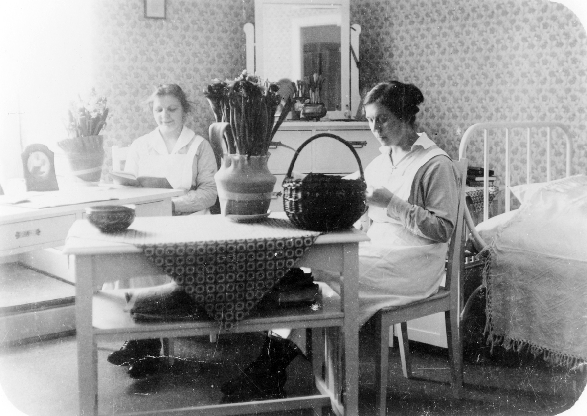 Personalbostad för sjuksköterskor på Alingsås lasarett. Två kvinnor sitter vid var sitt bord.