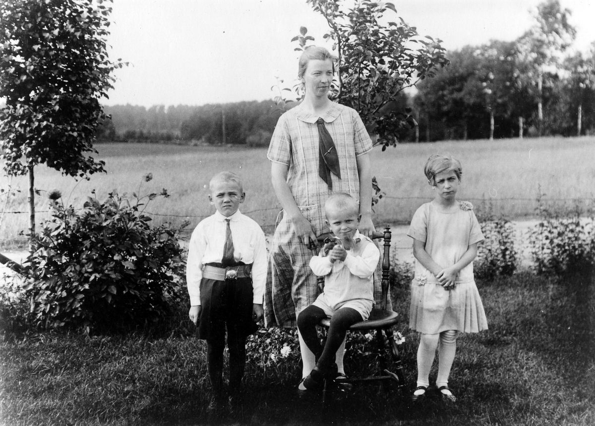 Kvinna med två pojkar och en flicka i trädgården. Eventuellt Bergstena socken.