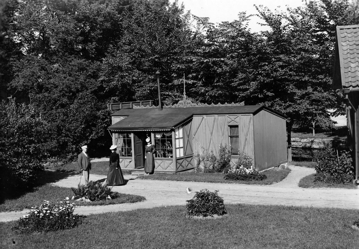 Två kvinnor och en man utanför Karin Möllers fotoateljé. Ateljén, som låg på bryggeritomten vid Lillån, övertog Möller efter fotograf Herman Hansen Scauw.