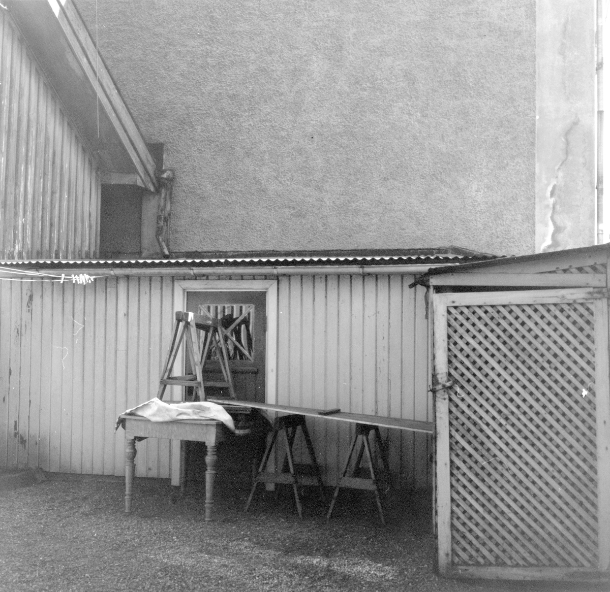 Bord och bockar utställda längs ett uthus på innergård i kv Alströmer.