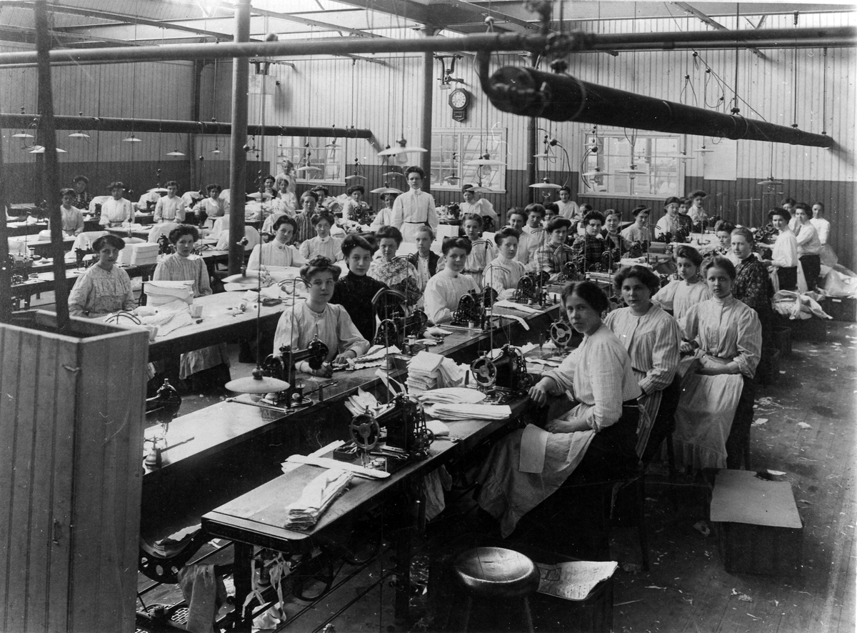 Inifrån Linnefabrikens arbetslokaler. Bilden visar flera långa, smala arbetsbord med ett 50-tal kvinnor framför var sin symaskin, alla vända mot kameran.