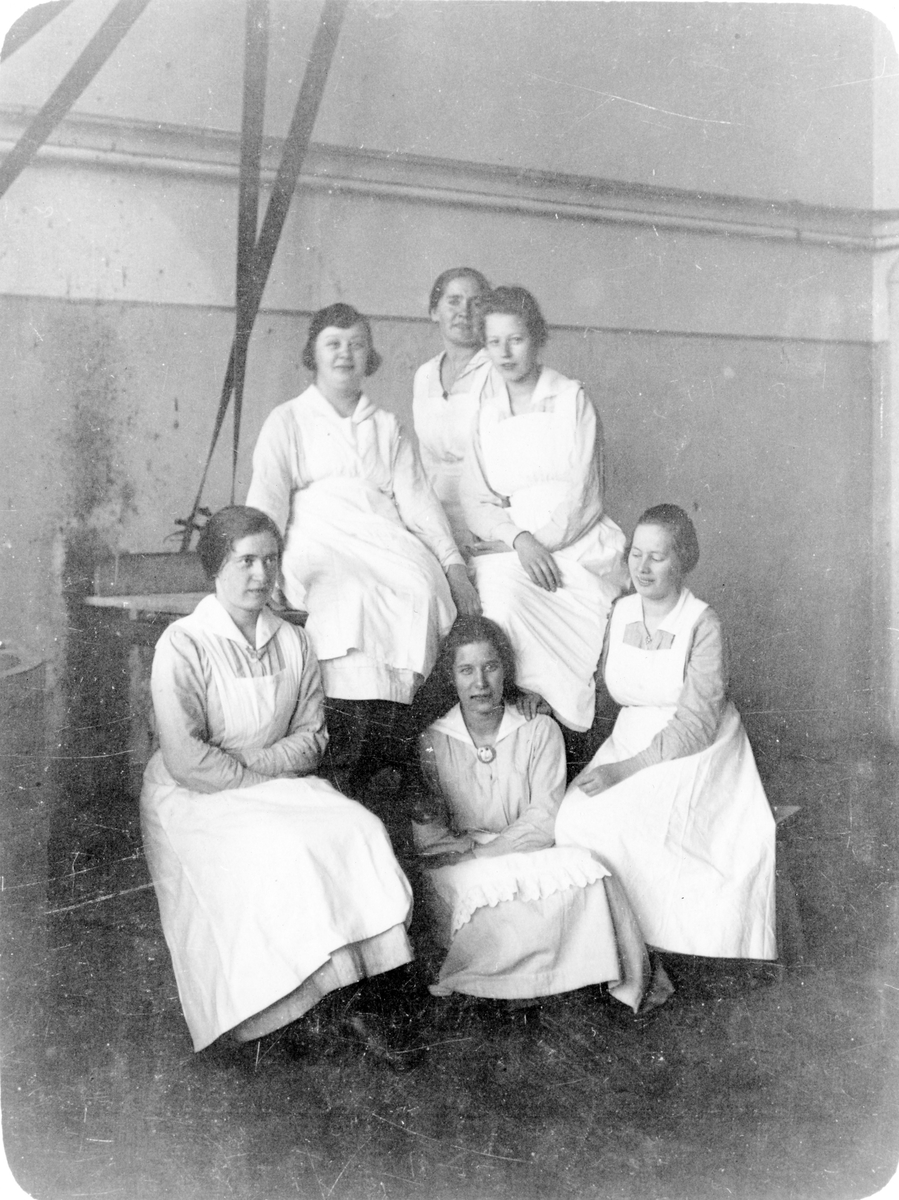 Gruppbild av 6 kvinnliga sjuksköterskor som arbetar på Alingsås lasarett.