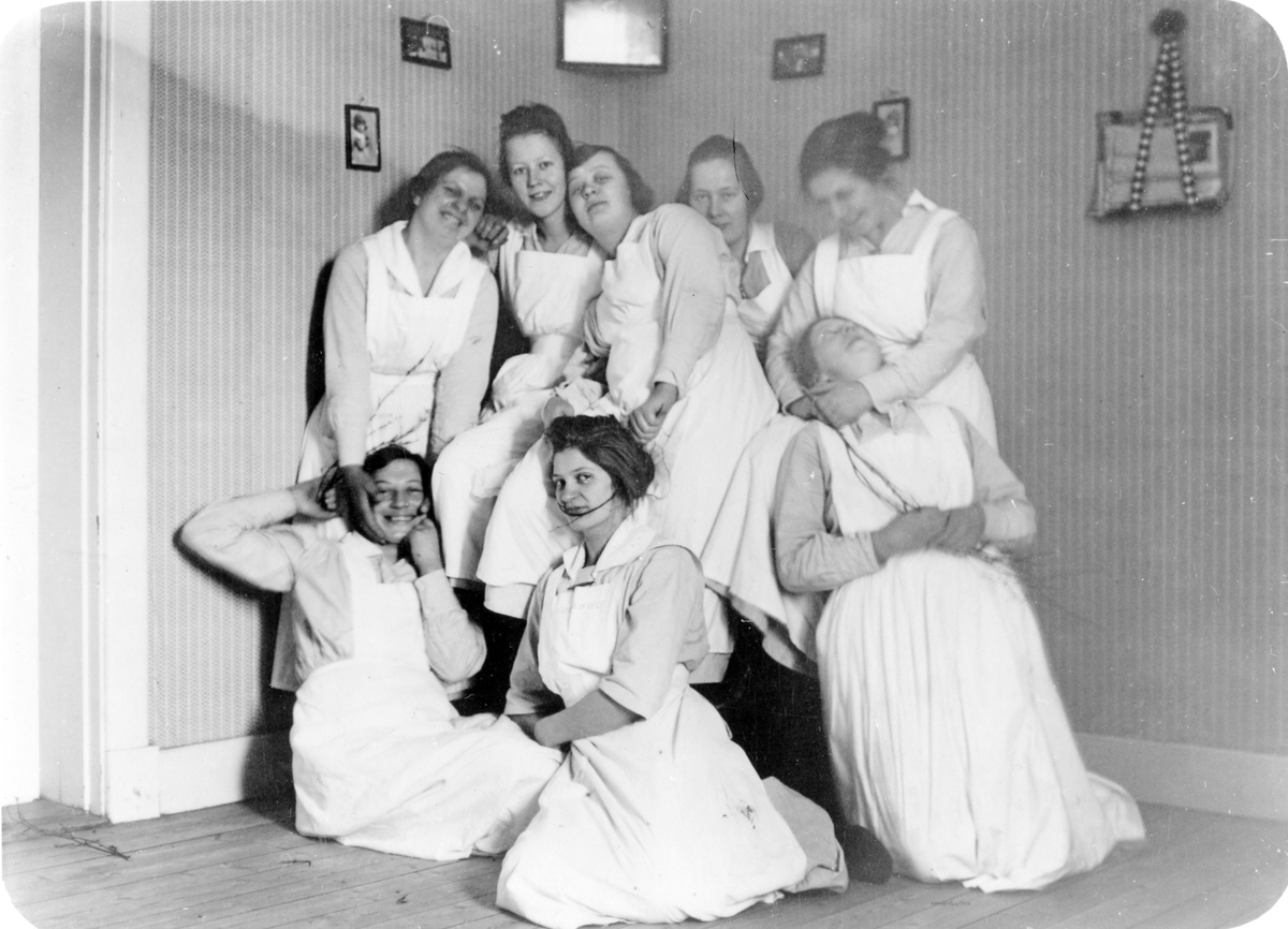 Gruppbild av 8 kvinnliga (troligen) biträden som spexar inför kameran.