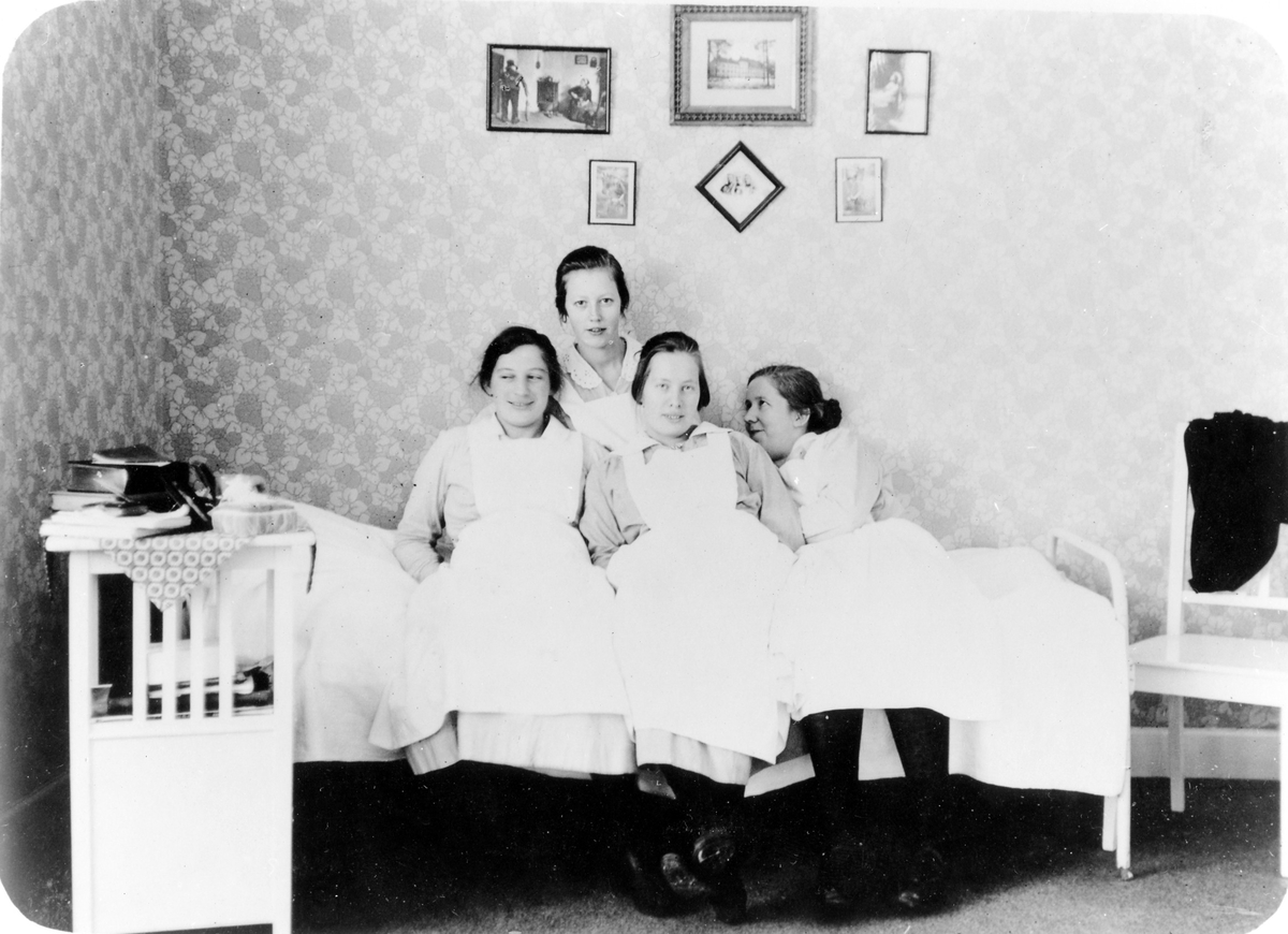 4 kvinnliga sjuksköterskor på Alingsås lasarett sitter på en säng i en sjuksköterskebostad.