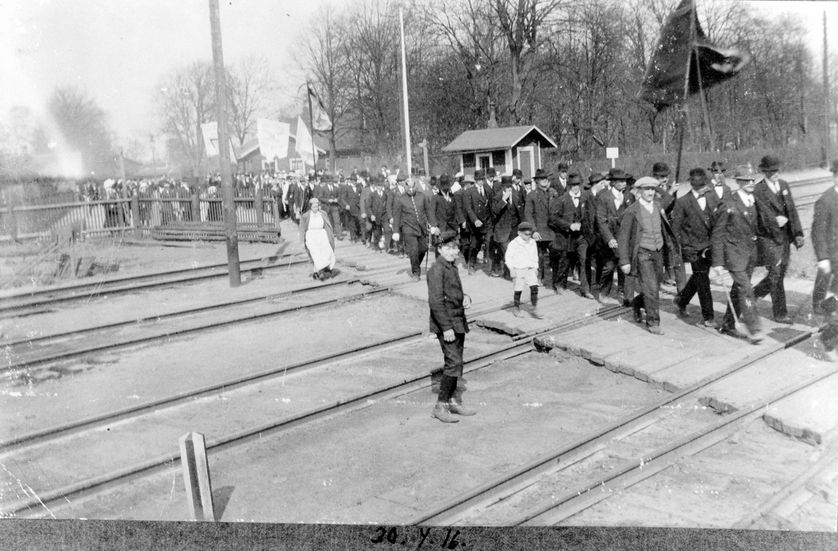 Demonstrationståg 1:a maj, passerar här järnvägsövergången.