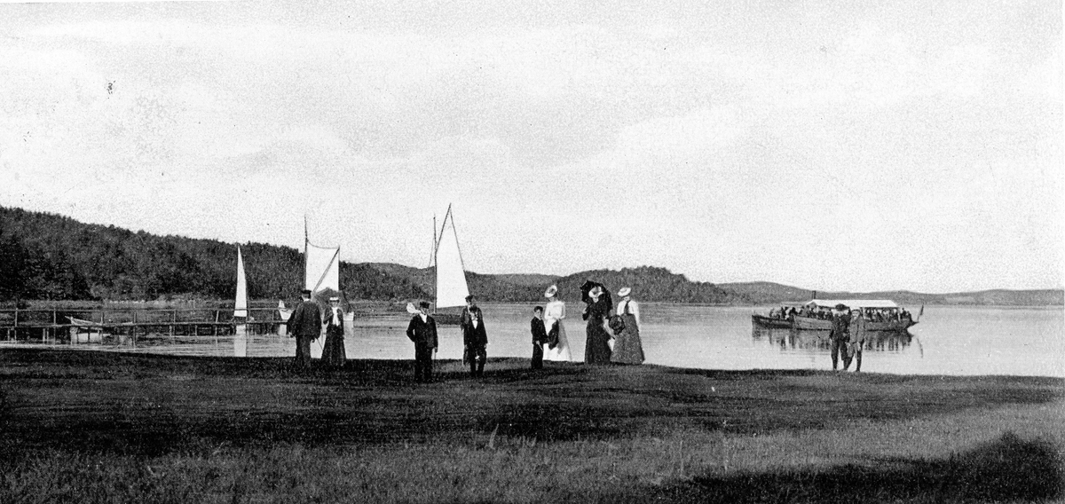Bild tagen ut mot Mjörn. Tre segelbåtar ses på sjön samt en större sällskapsbåt för flera passagerare. På sjökanten ses män, kvinnor och barn. Bilden är på ett vykort med texten "Espevik vid Alingsås" "Hjärtlig lyckönskan på namnsdagen den 14/3 1905 af Sofia" "Imp. Alingsås Pappershandel." "Foto: Kaleb Torin, Alingsås".