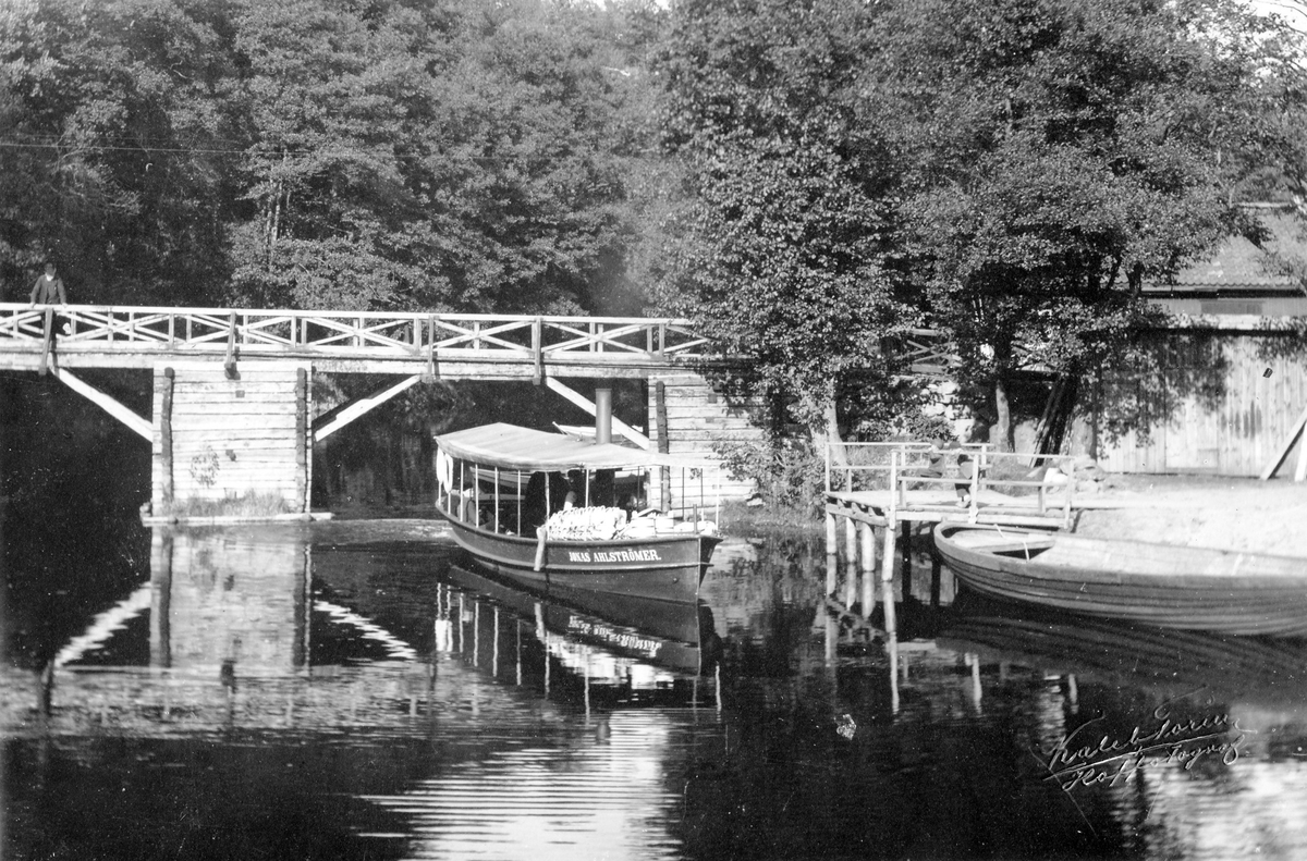 Under Nolhagabron ses ångslupen "Jonas Alströmer" med passagerare röra sig framåt, mot fotografen, förbi en träbrygga på höger sida.