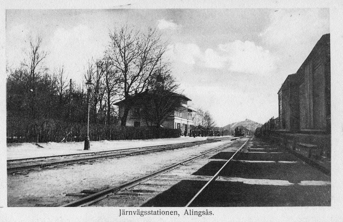 Alingsås Järnvägsstation. Ett tåg är på ingång till väntande människor på perrongen. I fjärran skymtar Härsberget med sitt vattentorn.
