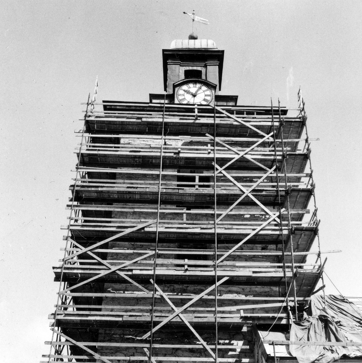 Alingsås Stadskyrka iklädd byggnadsställning vid ombyggnaden 1963. Tornets fasadputs togs bort och ny kopparplåt sattes på tornet.