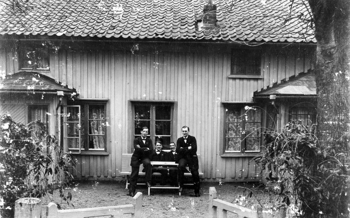 Fyra uppklädda män i en trädgård.