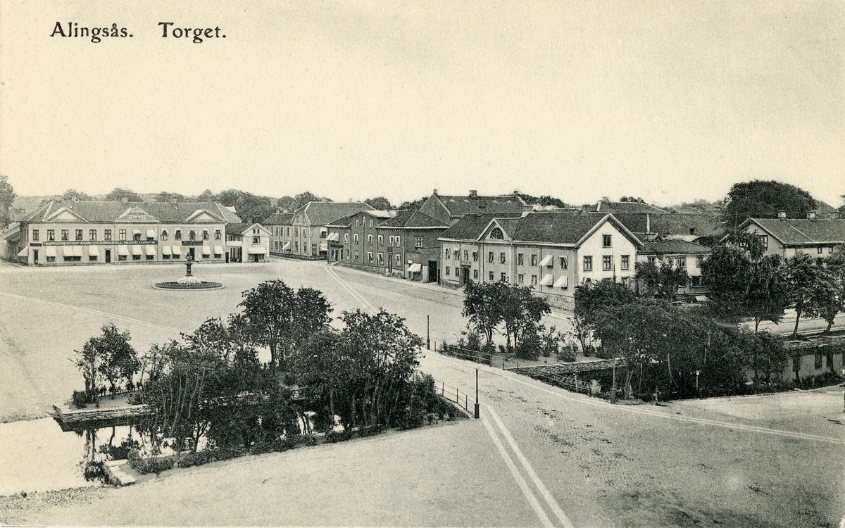 Vykort med motiv över Stora Torget. Till höger kv. Kronan med Hedéns byggnader och trädgården ner mot Lillån.
