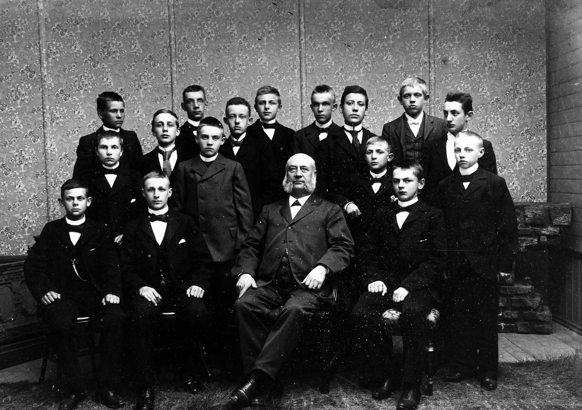Läroverket var åren 1831-1901 inrymt i rådhuset. Rektor Samuel Högman med elever.