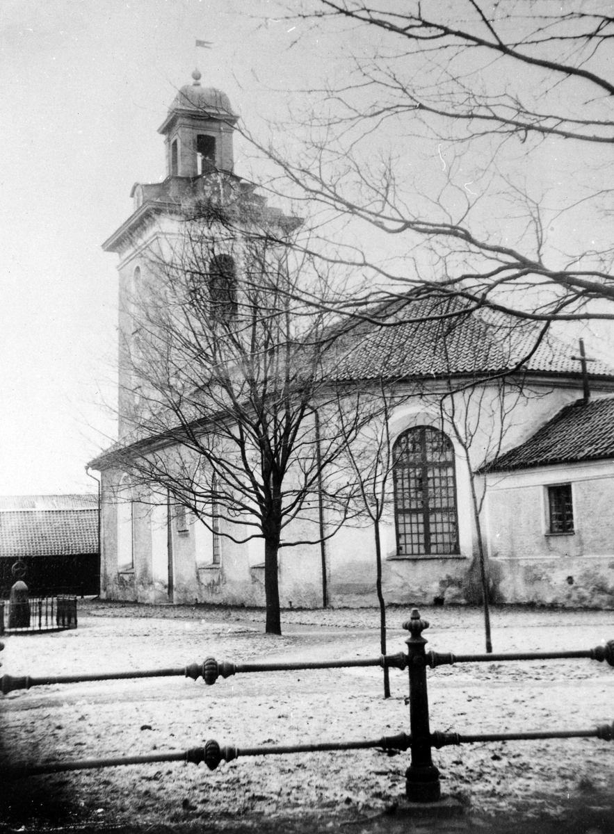 Snötäckt mark framför Stadskyrkan i Alingsås.