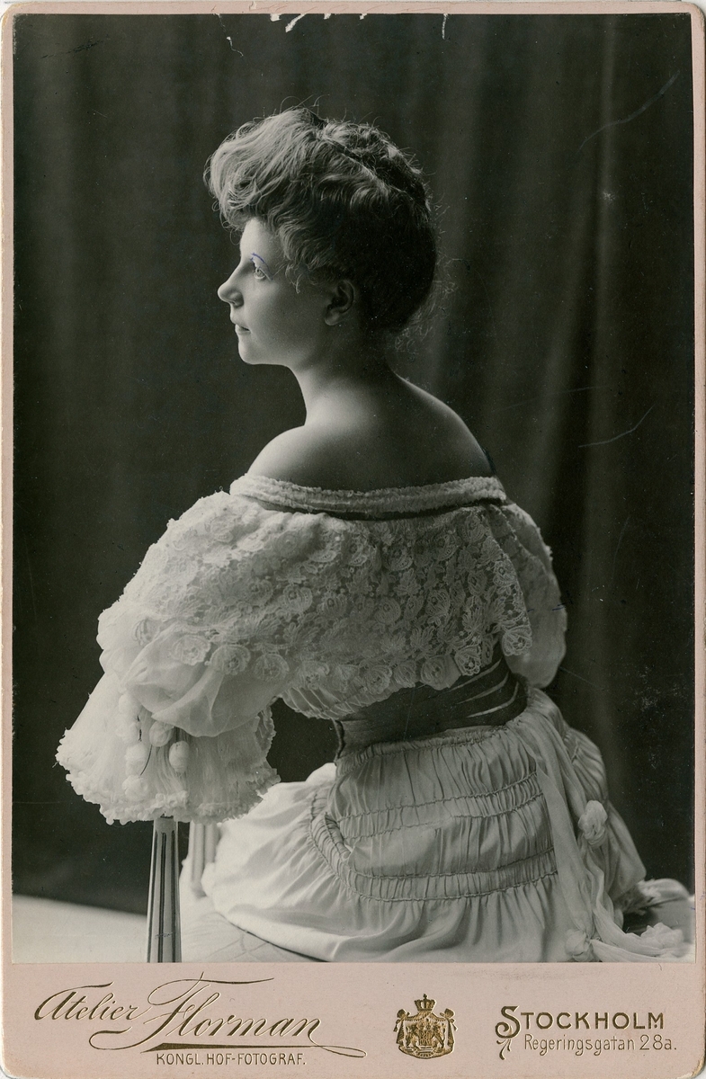 Ateljéporträtt av Bib Adelsköld. Hennes egna kommentar om bilden: "Stockholm 1900 "Amaranthen". Vitt siden, mjukt blankt guldskärp af "min brors uniformsskärp", hvita cgiffonärmar, hvit chiffonkjol med volang under klänningenm små guldskor. Tappade nästan underkjolen då jag just skulle niga för "Farfar" = kung Oscar. Jag klef ur underkjolen och tog den på armen och då spelade musiken upp: "Lotta, Lotta tappar kjolen, laga att hon inte tappar mer" - och alla sjöng!!! Så dansade vi fram till "Farfar Oscar" och öfrig Kunglighet, stannade och bockade och neg. Det var i Grand Hotells fästvåning. Bib Adelsköld 18 år. Detta foto togs när jag satt mellan tagningarna. Då jag såg copian till detta profkort köpte jag plåten och slog sönder den."
