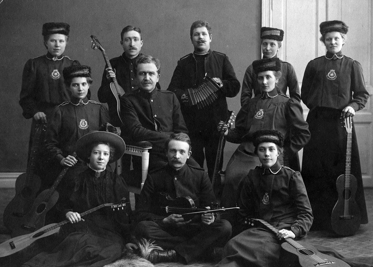 Gruppbild på 12 kvinnor och män i frälsningsarméns uniform, stående och sittande med var sitt musikinstrument från Frälsningsarméns musikkår.