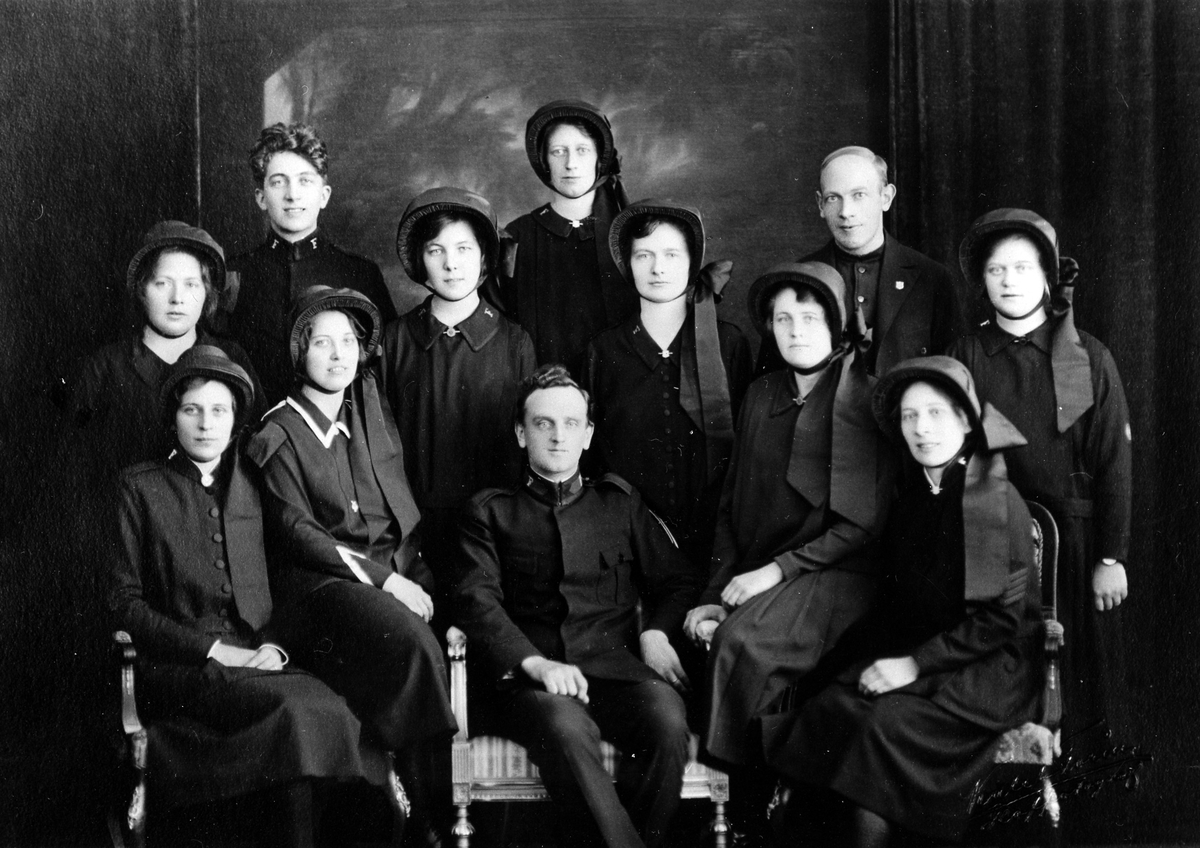 Gruppbild med 9 kvinnor och 3 män, i uniform, tillhörade Frälsningsarméns söndagsskolelärare.