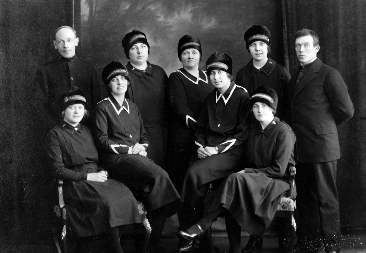 Gruppbild med 7 kvinnor och 2 män, i uniform, från Frälsningsarméns Samaritgrupp.