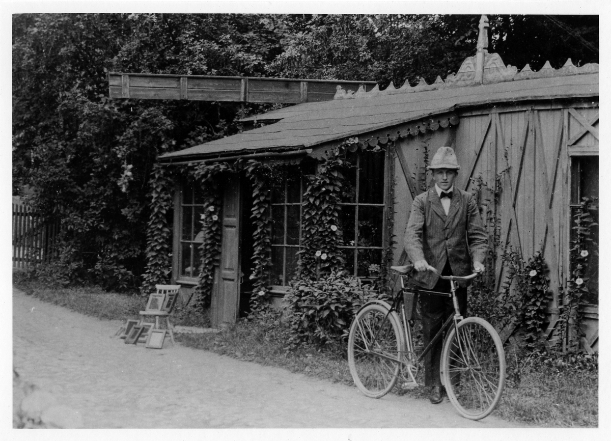 Okänd man som står med sin cykel utanför fotograf Karin Möllers ateljé i kvarteret Bryggaren. Delförstoring där man ser utkopieringsramarna vid stolen.
