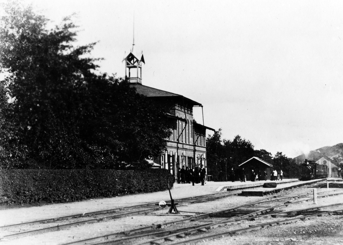 Människor på perrongen vid Alingsås Järnvägsstation väntar på det ankommande tåget.
