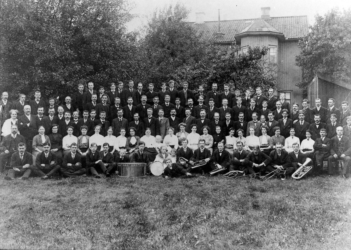 Alingsås Verkstäders snställda med familjer och musikkåren Kamraterna utanför NTO-huset i kvarteret Hammaren.