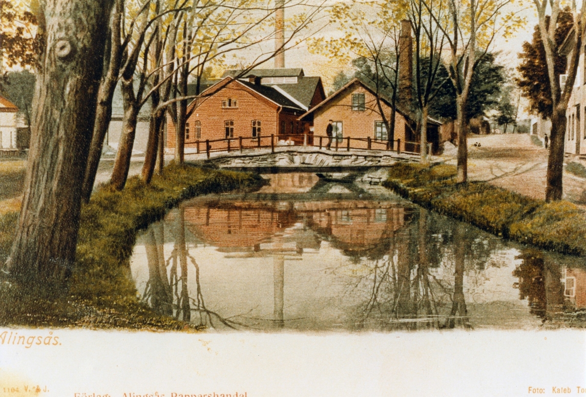 En färglagd målning av gasverket med gasverksbron och Lillån framtill. Kvarteret Ljuset.