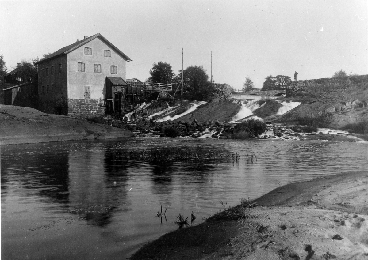 Källafors kvarn med en bro till höger där även en man skymtas.